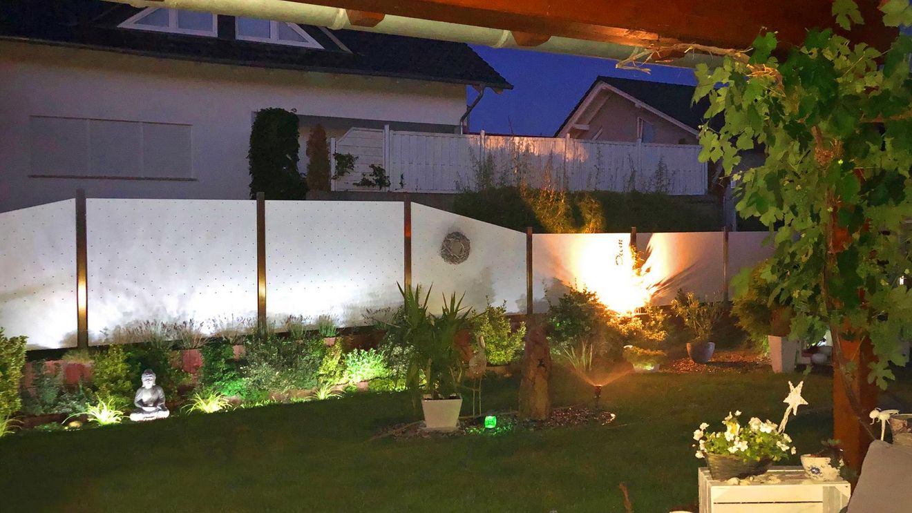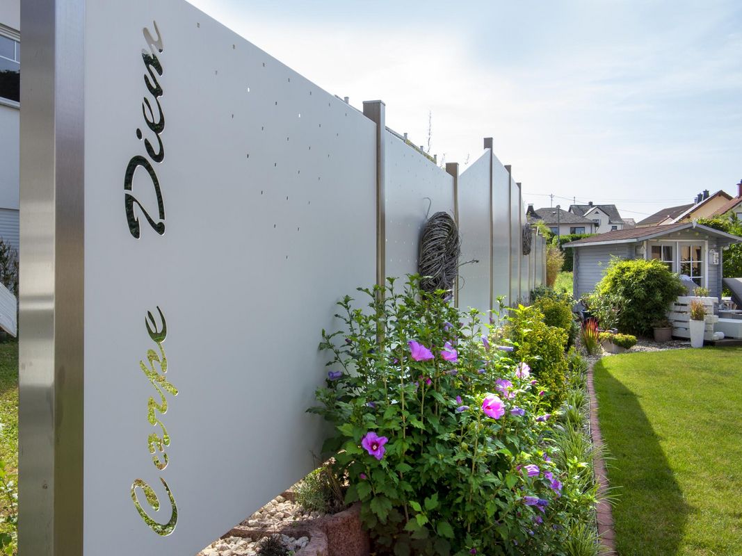 Corten steel motif perforation 1 Corten steel motif perforation ex.2 Powder-coated sheet metal fence Railing infill perforated plate Privacy screen soap bubble Terrace wall with motif perforation